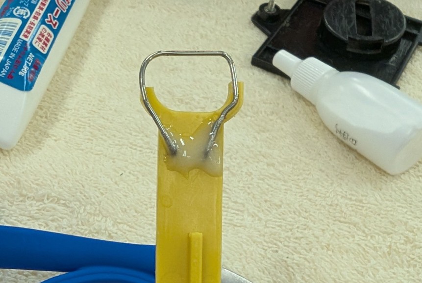 カムに当る部分のプラも折れて部品がなくなっていたので、ゼムクリップを曲げて部品を作りました。簡単に抜けないようにピンバイスで穴を開けて接着剤も併用して固定。まあ大丈夫でしょう。