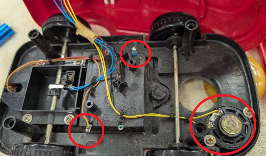 お手々がパタパタ動かない件ですが、これは専用の5輪目のタイヤがあり、軸についているカムでお手々を上下にパタパタ動かすしかけなのですがこの部分の分解に四苦八苦。簡単にとれそうなのですが、ネットで検索するとパチンとはまっている部分を破壊しないと取れないということで仕方なくニッパ―でパチンとやりました。最終的にはめ込むだけでも大丈夫そうだったのですが、軽く接着しました、再修理の時にちょっとだけ苦労するかも。