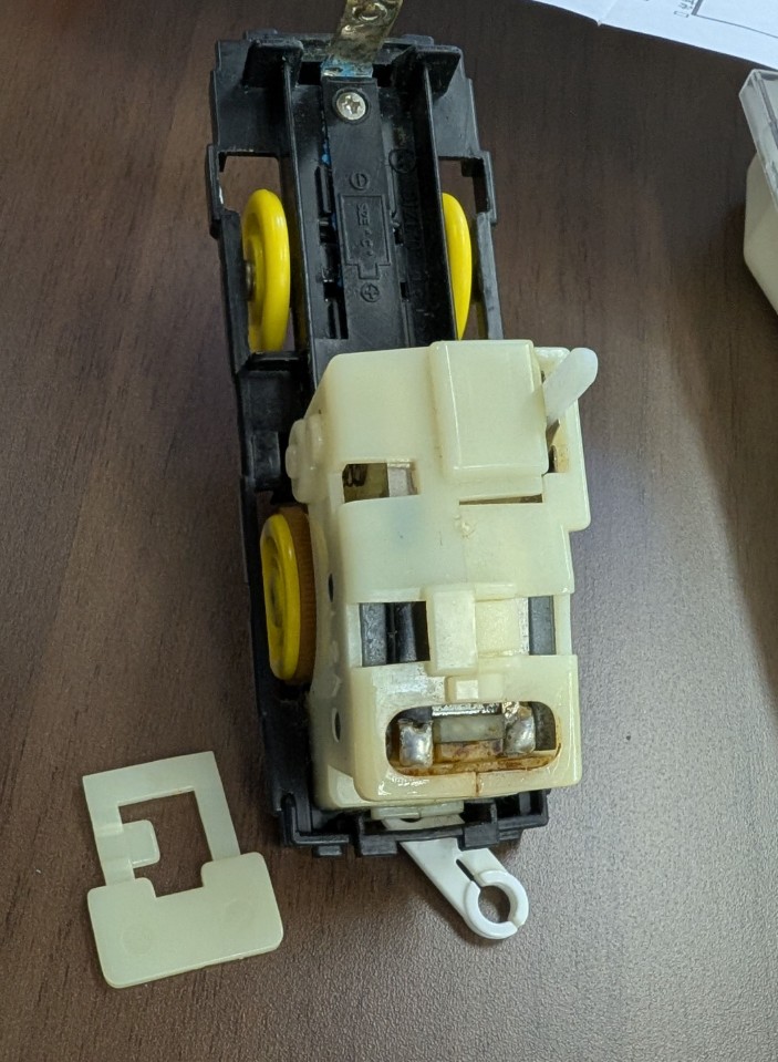 改めてこの状態で直接モーターに電池をつなげても回らないということで原因はモーターと特定。手ですこし補助するとかろうじて回ります。まあ交換ですね。たまたまリビルドしたモーター(下記の左)があったので今回はそれを利用します。