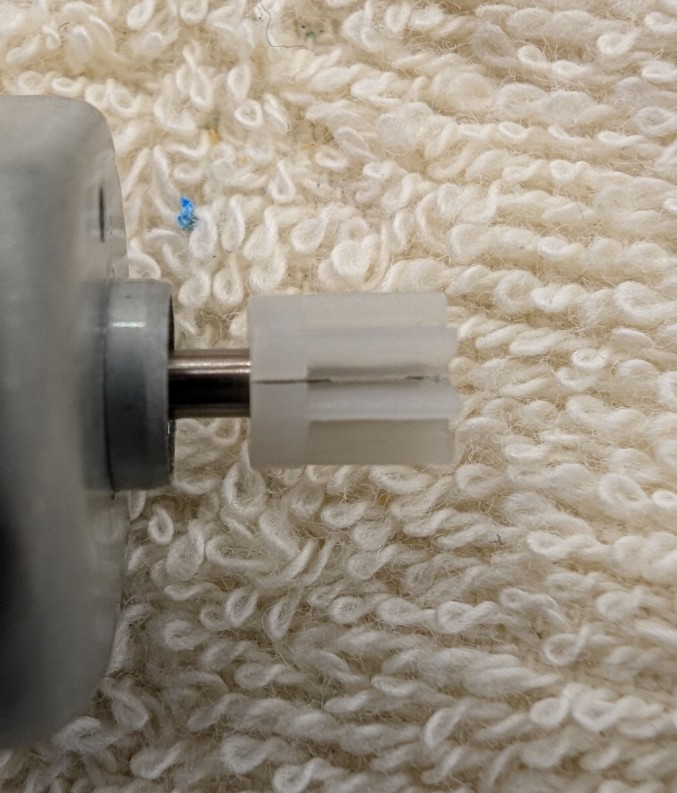 モーター交換で一応動くようにはなるのですが、モーターについているピニオンギア、、割れていますね。これだとスリップしてまともに走らなくなるのでついでに交換します。