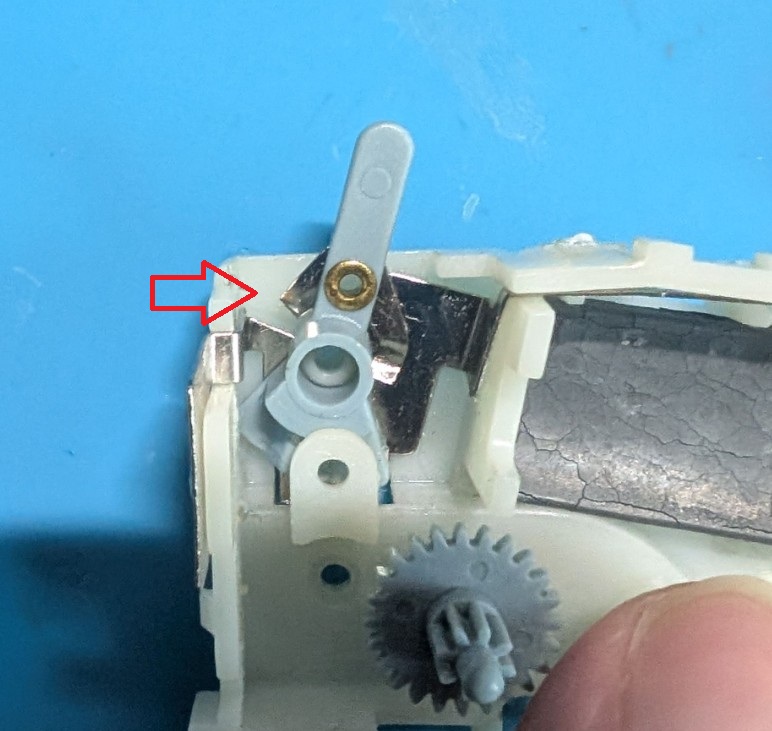 今回は幸い手持ちの壊れかかりのドナーの新幹線からスイッチ板金をいただきました。昔の子供のおもちゃで調子悪いのを取っておいてよかった。ついでにギアも2個いただきました。モーターについている 8歯のギアはあるんですが、2番目の回転方向を変えるクラウンギアは手持ちありませんので良かった。3Dプリンターで作れるかそのうちチャレンジしたいです。