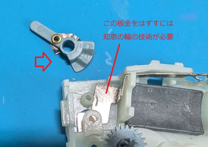 さて接点の清掃だけではダメだったので分解していきます。モーターの電極部分には接着されたカバーがありまして、これはこじって無理やりあけるしかありません。古いものはこのカバーは無いのですが安全対策で追加されたのかもしれません。電池交換の時に触れることができる場所です。感電は無いと思いますがモーター電極へのハンダのカド・ツノがあるとケガの可能性が皆無というわけではないのかな。