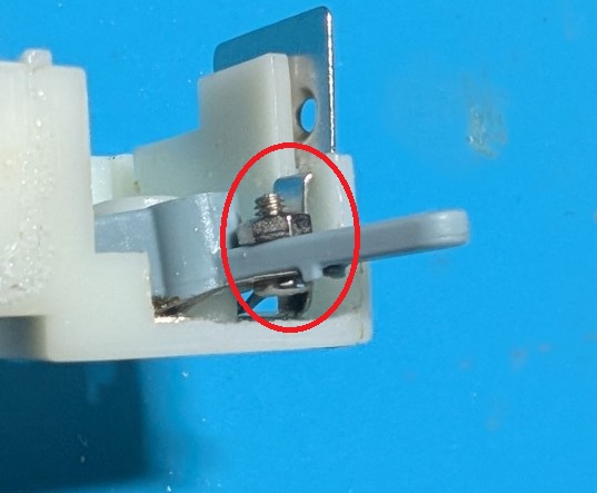 下記は裏側。ハトメ部分でレバーが折れることはあるようです。接点板金を切り出すのは手間がかかりそう(今回は部品ごと交換しました)。